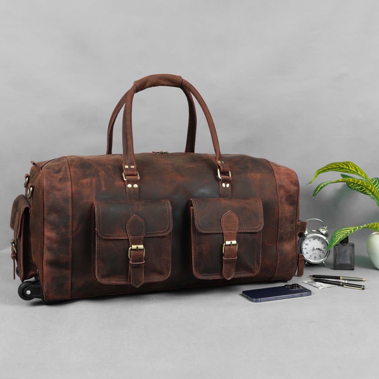 Experimenta un viaje sin esfuerzo con el Bolso de Cuero Laurel con Ruedas. Fabricado con cuero de búfalo de grano completo de primera calidad y equipado con herrajes de latón duraderos, este bolso artesanal ofrece tanto elegancia como practicidad. Cuenta con ruedas de desplazamiento suave, un asa discreta, correas de hombro ajustables y desmontables, dos bolsillos frontales, un bolsillo lateral y resistentes asas superiores de cuero para opciones de transporte versátiles. Disponible en tres tamaños diferentes, está listo para satisfacer todos tus requisitos de equipaje para cualquier viaje.